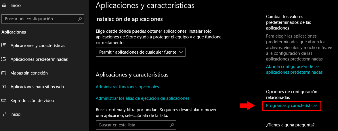 También se puede usar el antiguo panel de programas y características de las versiones anteriores de Windows si hacemos clic en programas y características que tenemos al lado derecho.