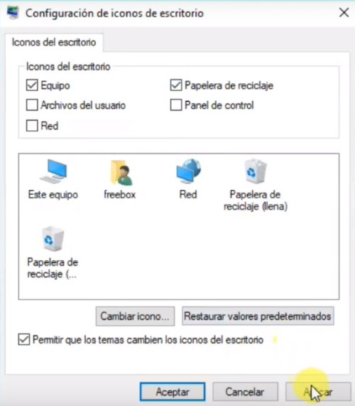 Llegados a este punto solo hay que marcar la casilla de los iconos que quieras que aparezca en el escritorio en este caso la papelera de reciclaje de Windows, aplicar y aceptar.