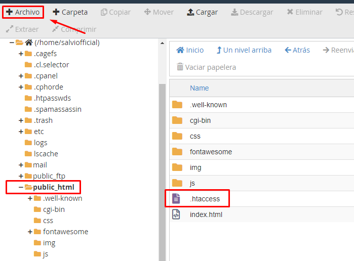 Tenemos que ir al directorio raíz de nuestro servidor en la mayoría de los casos public_html, una vez en el directorio creamos un nuevo archivo con este nombre .htaccess