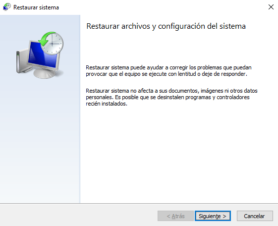 Ahora se abrirá el panel de restaurar sistema un clic en siguiente