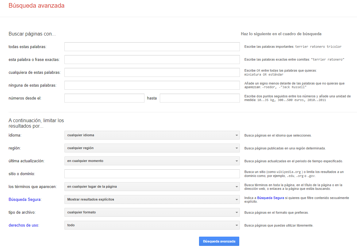 Antes de enseñaros los más habituales, debéis saber que Google dispone de una página de búsqueda avanzada que te puede ahorrar el uso de footprints si lo que necesitas no requiere de filtros demasiado complejos: En sus páginas de soporte, Google también ofrece una lista de símbolos o palabras básicas para restringir búsquedas. Vendrían a ser los Footprints oficiales. Te servirán igualmente para combinarlos entre sí o con los no oficiales.