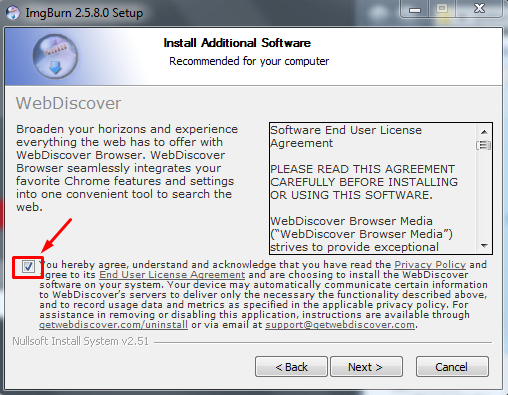 Instalar IMG Burn, «vigilar» durante la instalación tenemos que desmarcar la casilla de WebDiscover o nos instalaran publicidad.