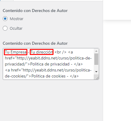 Aquí podemos modificar los enlaces existentes de las paginas legales, el nombre de nuestra empresa y nuestra dirección. También podríamos añadir mediante texto y HTML mas información personalizada.