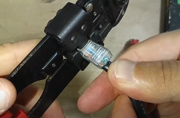 En este punto solo hay que meter el conector dentro de la crimpadora y presionar, no hay que hacer mucha fuerza o podemos romper el casquillo, mejor repetir varias veces pero con poca presión. Una vez crimpado estiramos para ver que no se sueltan.
