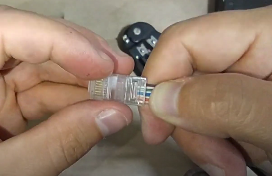 Luego ya solo nos queda meter los cables dentro del conector RJ45. Al principio te se moverán mucho los cables al ponerlos dentro del casquillo, hay que hacer un movimiento rápido con decisión.