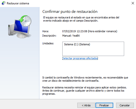 Como crear un punto de restauración en Windows 10.