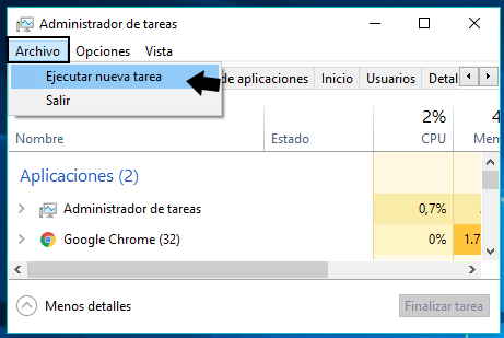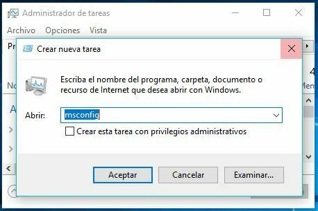 Se abrirá el administrador de tareas, hacemos clic en archivo > ejecutar nueva tarea > escribimos msconfig