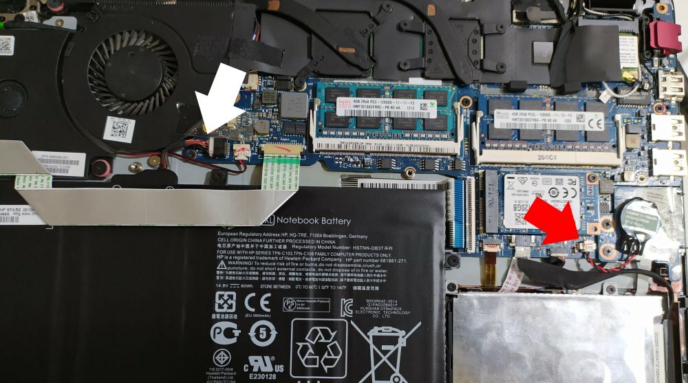 Una vez retirada la tapa veremos los conectores de la batería (flecha blanca) y la pila (flecha roja) los desconectamos durante 5 minutos y hacemos una prueba de encendido para ver si arranca el sistema operativo con normalidad.