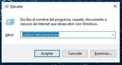 Abrimos ejecutar presionando la tecla Windows + R las dos a la vez, escribimos control netconnections y aceptamos.