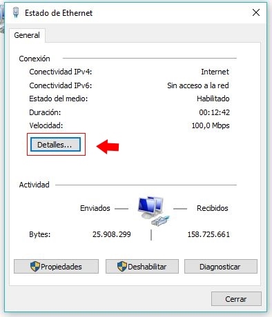 Ahora hacer clic en detalles se abrirá una ventana con todas las propiedades de la conexión de red seleccionada, podremos ver: