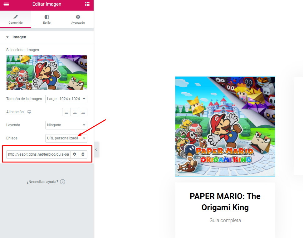 Es simple, hacemos clic encima el elemento para que nos muestre las propiedades en el panel izquierdo, buscamos donde dice enlace le damos al desplegable y escogemos URL personalizada. A continuación abajo nos aparece un campo donde pondremos la URL (Enlace) que queremos que nos lleve al hacer clic en la imagen.